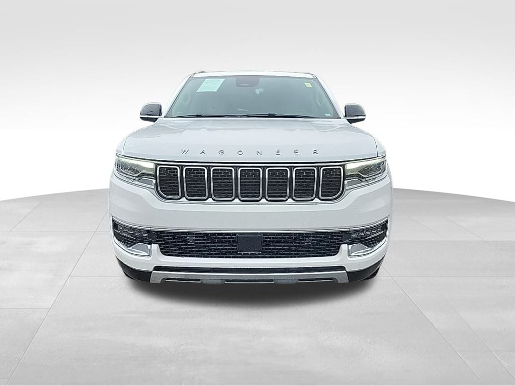 Certified. Bright White Clearcoat 2023 Jeep Wagoneer Series III RWD 8-Speed Automatic 3.0L I6 10 Speakers, 20" x 9.0" Aluminum Wheels, 3.55 Rear Axle Ratio, 3rd row seats: bench, 4-Wheel Disc Brakes, 60/40 Power Recline 3rd Row Seat, ABS brakes, Adjustable pedals, Air Conditioning, Alloy wheels, AM/FM radio: SiriusXM with 360L, Anti-whiplash front head restraints, Audio memory, Auto High-beam Headlights, Auto-dimming door mirrors, Auto-dimming Rear-View mirror, Auto-leveling suspension, Automatic temperature control, Brake assist, Bumpers: body-color, Compass, Delay-off headlights, Driver door bin, Driver vanity mirror, Driver's Seat Mounted Armrest, Dual front impact airbags, Dual front side impact airbags, Electronic Stability Control, Emergency communication system: Automatic SOS Call, Exterior Parking Camera Rear, Four wheel independent suspension, Front anti-roll bar, Front Bucket Seats, Front Center Armrest w/Storage, Front dual zone A/C, Front fog lights, Front reading lights, Fully automatic headlights, Garage door transmitter, Genuine wood console insert, Genuine wood dashboard insert, Genuine wood door panel insert, Heads-Up Display, Heated door mirrors, Heated front seats, Heated rear seats, Heated steering wheel, Illuminated entry, Knee airbag, Leather Trimmed Bucket Seats, Low tire pressure warning, Memory seat, Navigation System, Normal Duty Suspension, Occupant sensing airbag, Outside temperature display, Overhead airbag, Overhead console, Panic alarm, Passenger door bin, Passenger seat mounted armrest, Passenger vanity mirror, Pedal memory, Power adjustable front head restraints, Power door mirrors, Power driver seat, Power Liftgate, Power passenger seat, Power steering, Power windows, Preferred Equipment Group, Quick Order Package 25N, Radio data system, Radio: Uconnect 5 Nav w/10.1" Display, Rain sensing wipers, Rear air conditioning, Rear anti-roll bar, Rear dual zone A/C, Rear reading lights, Rear seat center armrest, Rear window defroster, Rear window wiper, Reclining 3rd row seat, Remote keyless entry, Security system, Speed control, Speed-sensing steering, Speed-Sensitive Wipers, Split folding rear seat, Steering wheel memory, Steering wheel mounted audio controls, Tachometer, Telescoping steering wheel, Tilt steering wheel, Traction control, Trip computer, Turn signal indicator mirrors, Variably intermittent wipers, Ventilated front seats, Voltmeter.